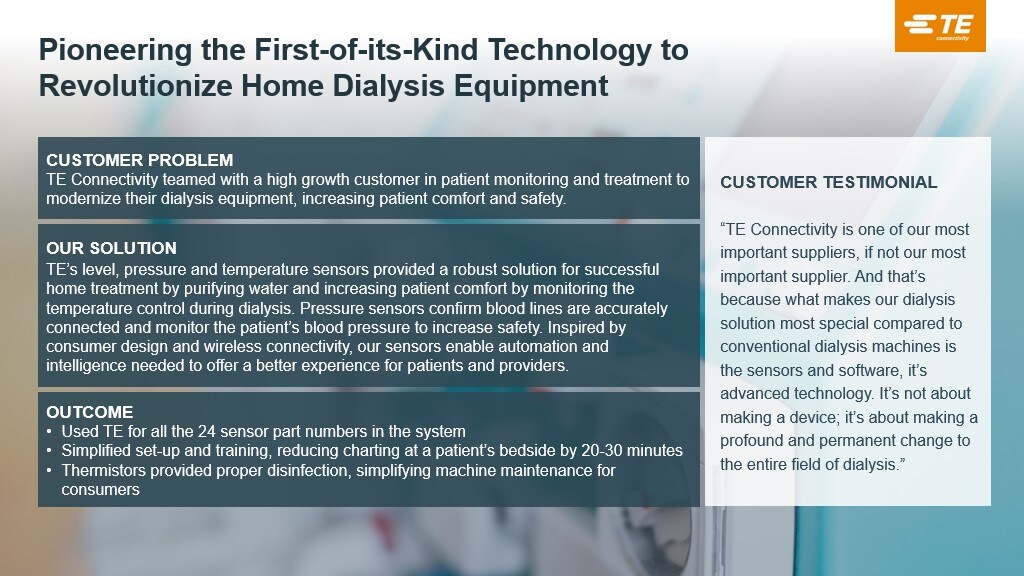 浏览 TE 发布的关于下一代透析机的最新白皮书。了解先进的传感器如何增强参数控制、改善患者护理和舒适度。获取有关传感器选择关键考虑因素的专家见解。