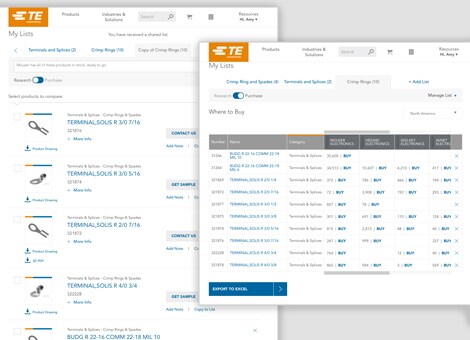 TE lists are a powerful way for you to save products that interest you for further research and purchase. Create multiple bills of materials that you can send to your colleagues, export to Excel, and view availability by distributor.