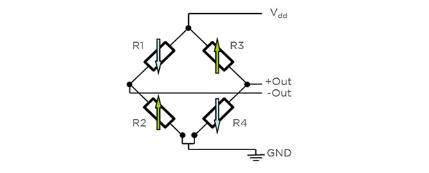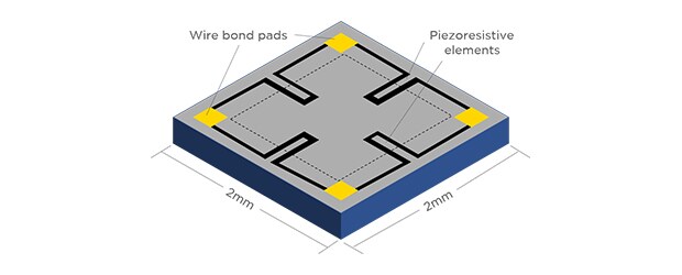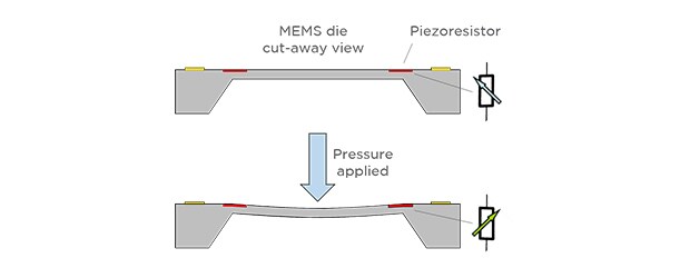 对 MEMS 元件施加压力时,它像弹簧垫一样偏转。偏转在压阻式元件中形成张力,它们根据偏转的比例改变其电阻值