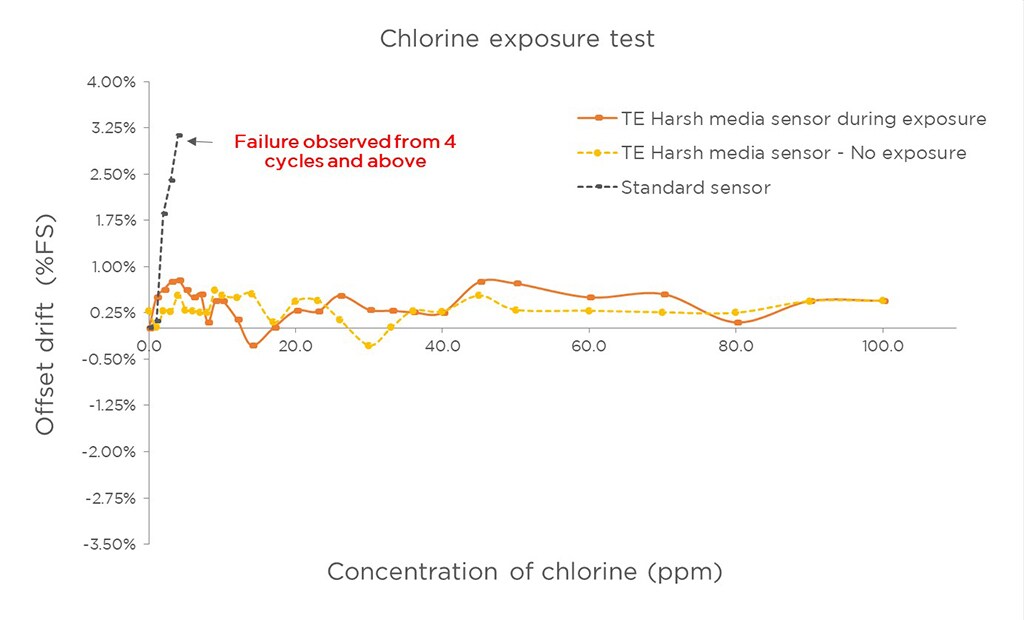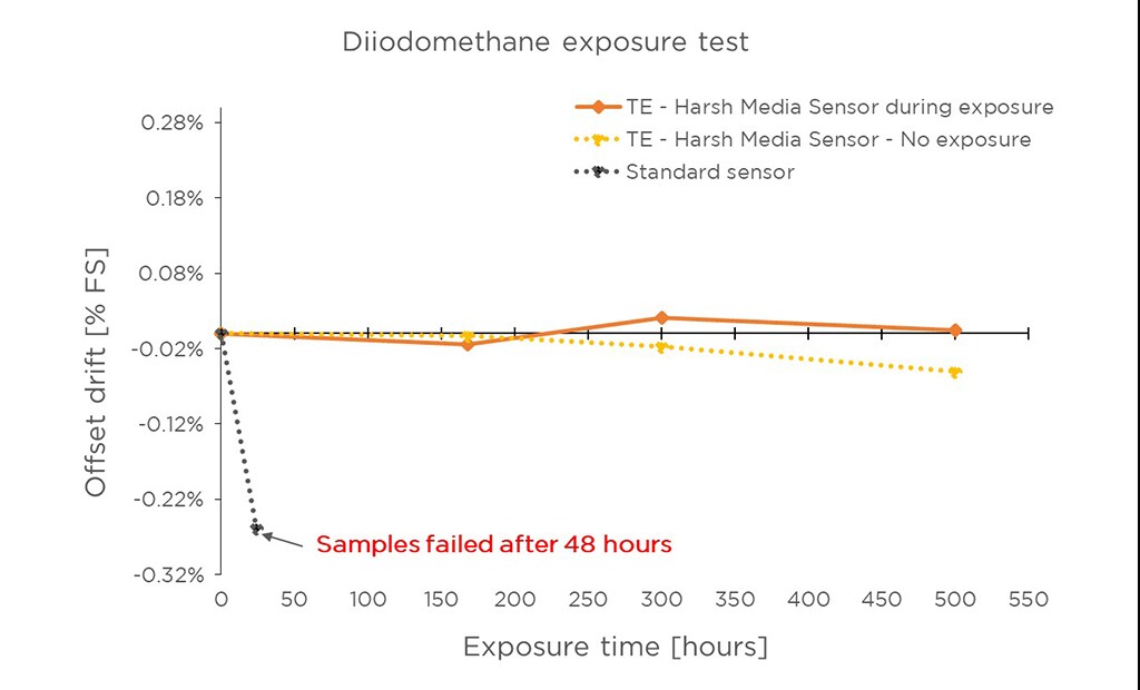 通过将传感器包装暴露于盐水、氯水和二碘甲烷气体中,TE Connectivity 开发的新技术和设计已经过测试。结果显示二碘甲烷暴露环境是最严苛的测试。下图显示了传感元件在二碘甲烷和氯水暴露环境中的信号输出偏移。偏移被认为是非常有限的。此外,偏离中的偏移可以主要通过潮湿环境(而不是二碘甲烷)的存在来解释。另一项在 85°C 和 85% 相对湿度条件下执行的加速寿命测试显示偏离和跨度有相同的偏移,如二碘甲烷结果中所示。